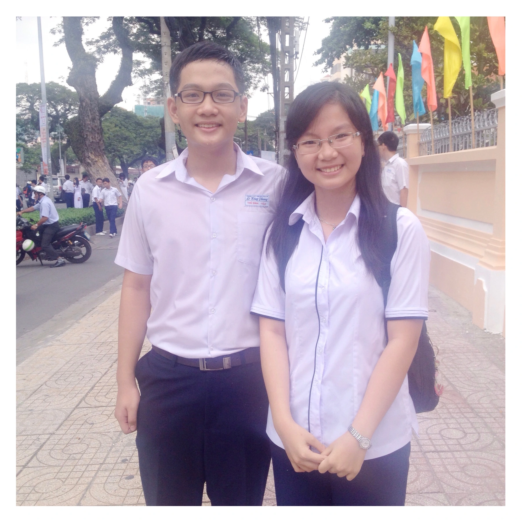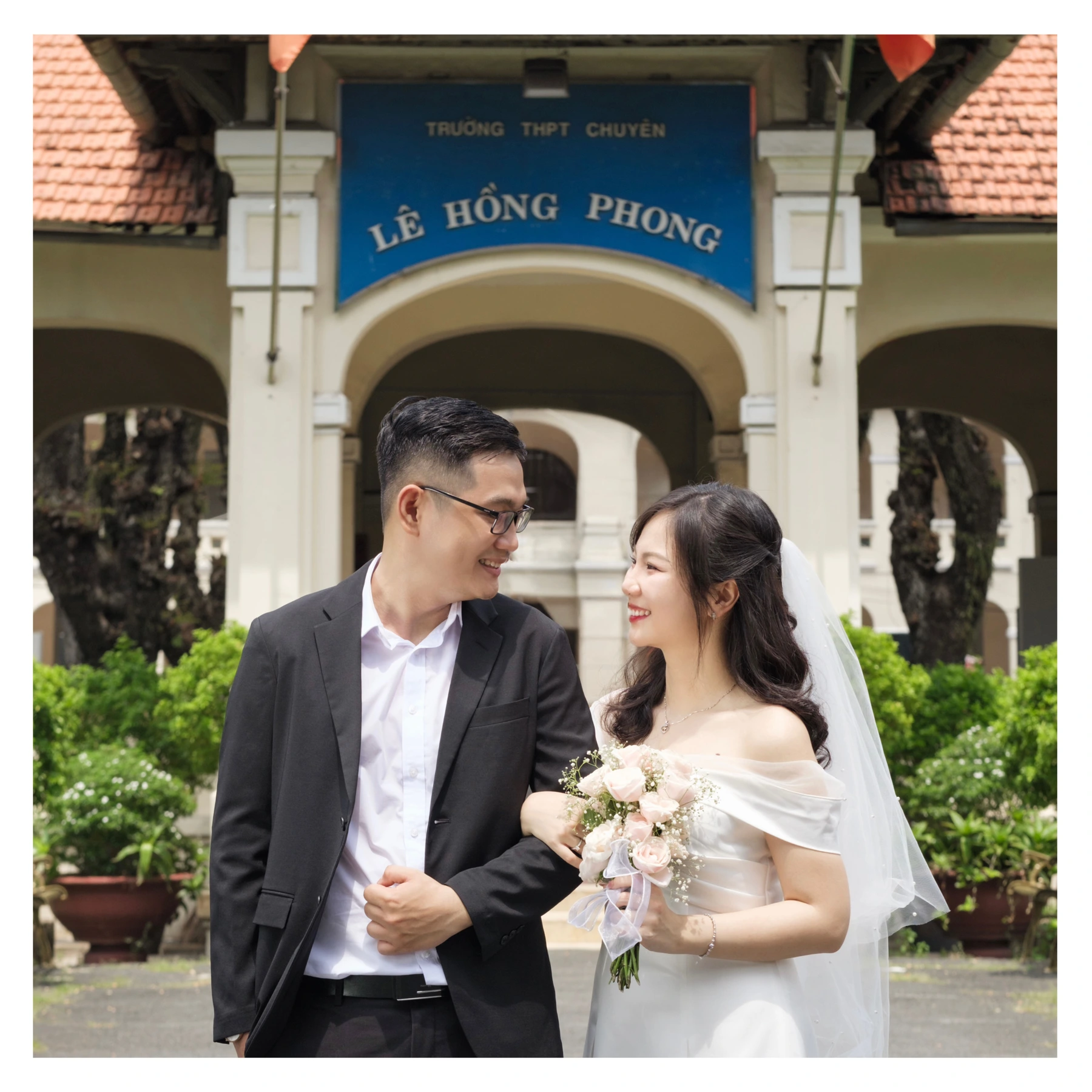 Nu vẫn nhớ một khoảnh khắc nhỏ xíu mà đến giờ chưa từng quên. Hồi đó ngồi ngay sau lưng Trinh tỷ, có lần (hình như năm lớp 11), vô tình thấy màn hình điện thoại sáng lên với tin nhắn từ một người lưu tên “Cá Voi” :)) Không còn nhớ nội dung là gì, chỉ nhớ lúc đó Nu đã nghĩ — sao hai người này ở ngoài nhìn cũng đâu có sến, mà nhắn tin với nhau lại cưng dữ vậy :))) Trong ký ức của Nu, Trinh lúc nào cũng là một cô gái xinh đẹp, giỏi giang, và luôn rạng rỡ theo một cách rất tự nhiên suốt những năm cấp 3. Nu còn nhớ, cứ mỗi lần hết giờ ra chơi, Trinh gặp Thế Bình xong quay lại lớp, chưa bao giờ thấy một chút buồn bã hay lo lắng trên gương mặt — chỉ là một vẻ rất nhẹ, rất yên tâm, rất yêu đời. Rồi 10 năm trôi qua, nhìn hai bạn đi cùng nhau đến hôm nay, Nu thấy mọi thứ thật tròn đầy — như thể câu chuyện này ngay từ đầu đã luôn hướng về một cái kết như vậy. “Trai chuyên Lý – gái chuyên Văn” — tưởng khác mà lại rất hợp. Nu vẫn hay kể với bạn bè sau này rằng đây chính là “model” lý tưởng nhất một cặp đôi: thuộc về nhau theo một cách rất tự nhiên. Cảm ơn hai bạn vì đã cho Nu (và chắc là nhiều người khác nữa) được thấy một tình yêu không ồn ào, không phô trương, nhưng đủ bền bỉ để đi qua năm tháng, đủ ấm áp để người ngoài nhìn vào cũng thấy tin hơn vào tình yêu. Cảm ơn Hoàng Trinh và Thế Bình vì đã giữ được một điều gì đó rất trong trẻo giữa cuộc sống nhiều đổi thay. Chúc hai bạn sẽ luôn ở cạnh nhau như thế — vẫn là ánh mắt ấy, vẫn là sự trìu mến ấy, như những ngày đứng bên nhau giờ ra chơi ở Lê Hồng Phong năm nào 🤍